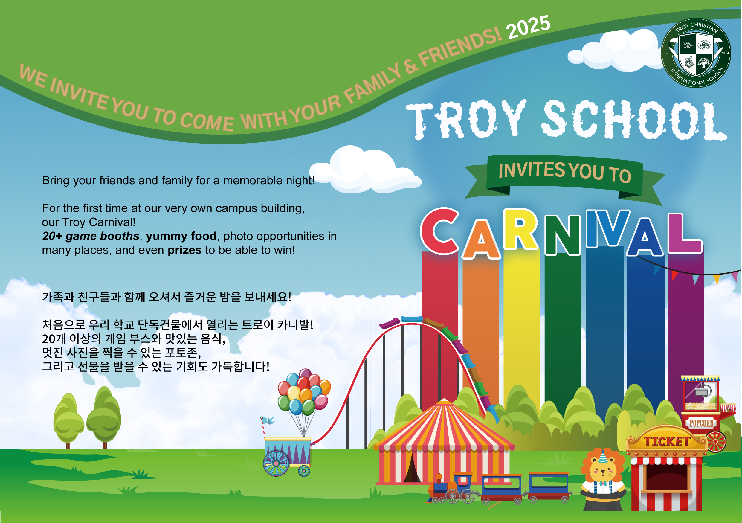 이번주가 드디어 찾아왔습니다! 우리 트로이 연례 카니발이 우리 캠퍼스에서 이번주 금요일에 진행됩니다!To kick off the night, we will have limited performances at the beginning of the carnival by our Troy Orchestra Team, ROAR Choir Team, and Kinder Zumba Mini’s!